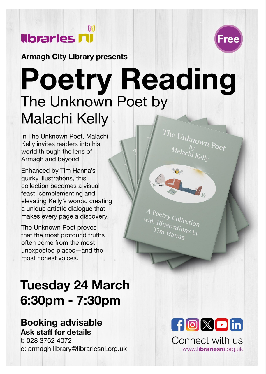 Second, a wee plug (on Tim’s behalf!) for a Poetry Reading on Tuesday 24th March in the Armagh Branch Library (Advert attached) which might be of interest to some. Copies available to purchase on the night!